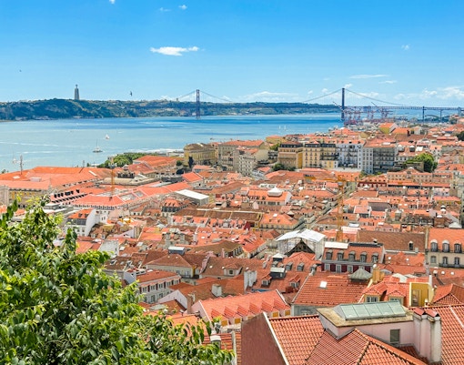 Aussichtspunkte auf den Hügeln mit Blick auf die Terrakotta-Dächer und den Fluss Tejo. Dies bietet Ihnen die Möglichkeit, die Skyline zu fotografieren, ohne lange Steigungen in Kauf nehmen zu müssen.